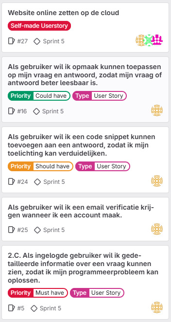 Tijdens de sprints verdeelden we de taken door aansluitende user stories te kiezen. Ook spraken we af hoeveel en welke should have's we voor onze website zouden willen hebben. De taakverdeling was tijdens het project eerlijk, en onze communicatie is sterk verbeterd. We zijn vaker gaan communiceren en doen dit nu duidelijker. |