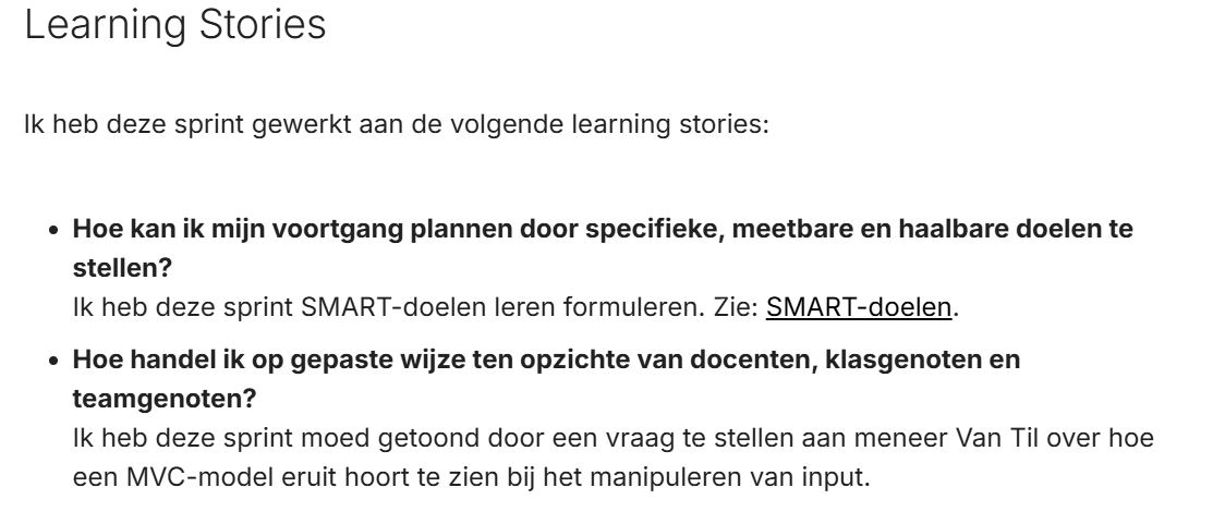 Ik heb deze sprint geleerd SMART-doelen te formuleren en meer vragen gesteld aan docenten. |